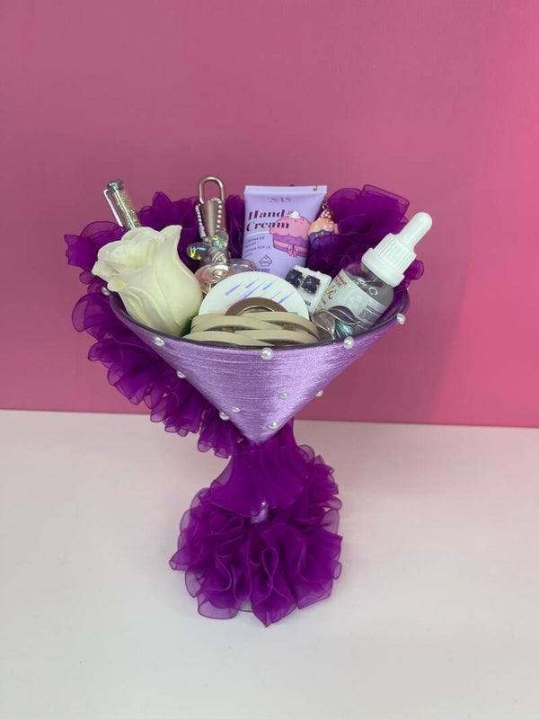 La Copa de belleza Purple Glam está decorada a mano con satinado lila, perlas y volantes de tul, e incluye una cuidada selección de productos de maquillaje y cosmética facial.
