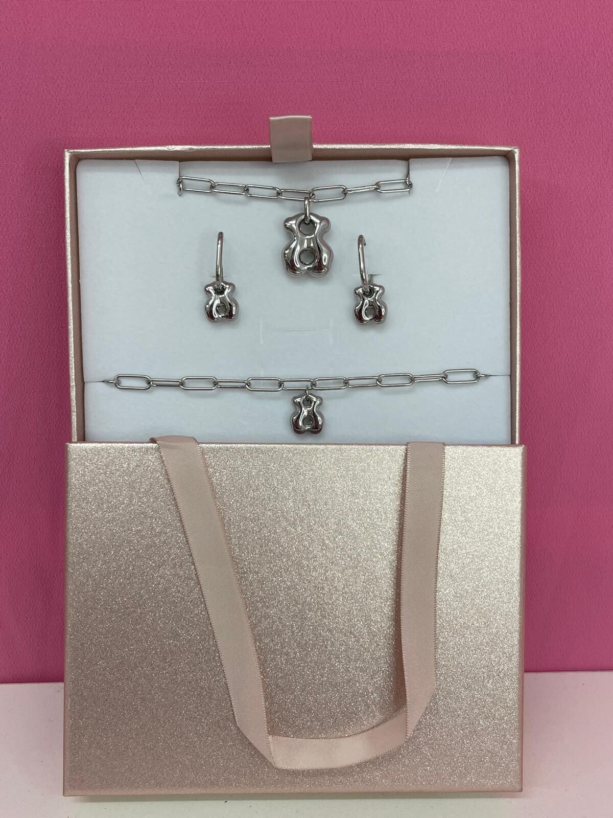 Este precioso conjunto de collar, pulsera y pendientes con charm de osito está elaborado en acero inoxidable, resistente al agua y al paso del tiempo. Ideal para darle un toque tierno y elegante a cualquier look.