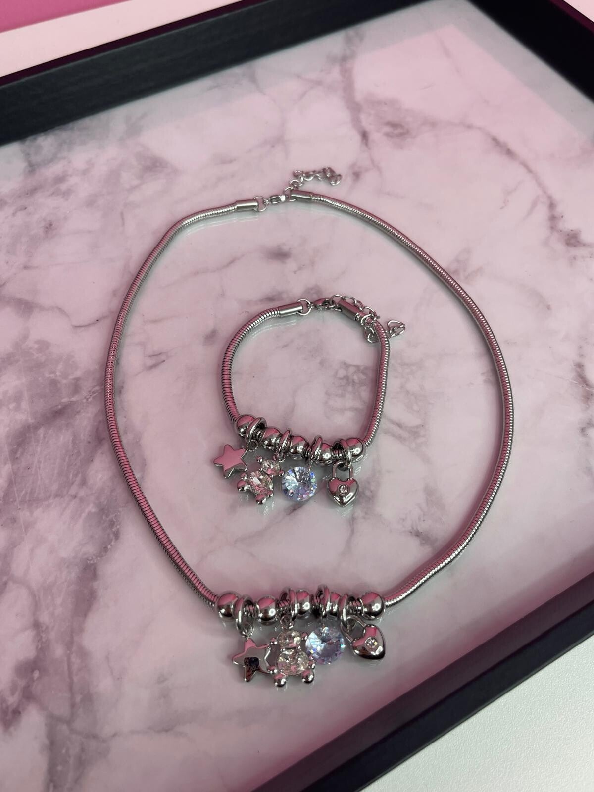 El Conjunto Brillo Blanco es una joya llena de luz y sofisticación, ideal para mujeres que aman destacar con un toque elegante y moderno. Formado por collar y pulsera tipo Pandora, combina la sobriedad del acabado plateado con charms colgantes en forma de estrella, corazón, osito y cristales brillantes que reflejan cada rayo de luz con destellos únicos.